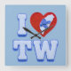 This design showcases crochet-style typography spelling a bold message of love for Taiwan, using soft yarn textures and a handmade aesthetic. Blue and white lettering references the iconic Taiwanese blue white slippers, while a vivid red heart highlights a Taiwan map detail. The contrast against a dark background enhances the tactile fiber art look, blending cultural symbolism with playful, textured typography for a visually warm and expressive composition.
