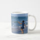 The mug has a photo with a young girl in a blue dress, dancing on the beach, right next to the sea and the waves, with seagulls flying around. The blue sky can be seen above, and the sea has shades of blue as well.