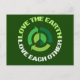 A beautiful environmental awareness postcard in green with a peace sign and the symbol for recycling around it to show that we need to work together to save the planet. Love the Earth. Love each other.