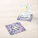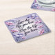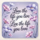 This coaster features a dreamy digital art image with the words "Love The Life You Live" and "Live The Life You Love" in black script. The words are centred on a calming lavender background. There are stylised flowers in lavender and pink, each flower arranged in an organic pattern. The coaster is a square lavender paper pulp coaster. There are six coasters in the coaster set.
