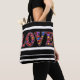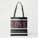 Love tote bag with black and white strips.