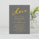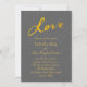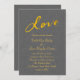 Love, written in a faux gold brush stroke decorates this wedding invitation on an illustrated grey linen background, keeping it elegant, glamourous, new and trendy. This invitation is shown on the basic paper; however, the weight and texture of the linen paper will enhance the background pattern of the invitation. This invitation is part of the Love Wedding Collection on Grey Linen.