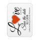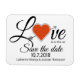 Wedding save the date magnet done in white with black text reading Love is in the air, with a red heart with an arrow replacing the o in love. Personalise the names and wedding date to suit your needs. Great way to announce your upcoming nuptials ahead of time.