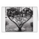 Black and white picture of wrought iron heart shaped sculpture and a matching message of love.