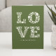 Trendy elegant folded greeting card featuring stacked letters spelling "LOVE" in white floral and geometric patterns over a richly coloured background. Personalizable message text. Perfect for Valentine's Day, Sweetest Day, wedding anniversary, or any day! Available in a curated selection of vibrant background colours. Also available as a modern flat card.