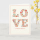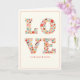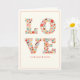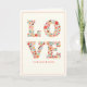 Trendy elegant folded greeting card featuring stacked letters spelling "LOVE" in floral and geometric patterns with a rounded border. Personalizable message text. Perfect for Valentine's Day, Sweetest Day, wedding anniversary, or any day! Available in a curated selection of vibrant background colours. Also available as a modern flat card.