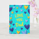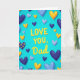This design shows a teal-blue background filled with floating hearts in different sizes and colors like deep indigo, soft lavender, and bright yellow. The hearts have a slight shadow that makes them look a bit like balloons drifting across the page. In the center, the words “LOVE YOU, Dad” stand out in warm yellow lettering. “LOVE YOU” is in rounded uppercase letters, while “Dad” is written in a smoother, cursive-style word just beneath it. One heart near the middle is dark purple with small yellow dots, adding a sweet little detail that catches your eye. The whole scene feels cheerful and caring, like a simple reminder that you’re thinking of him 🥰. It’s a meaningful card to give when you want to say thank you and show steady, everyday love ❤️. Hope it helps you share your Valentine’s Day feelings with someone special.