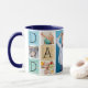 Love You Dad Personalised Photo Collage Mug. The perfect gift for Father Day or Birthday. Personalise this custom 5 photo collage design with your own pictures. Showcase memories on a coffee cup that Daddy can evoke daily. Background of lettering contains vertical and horizontal distressed stripes.