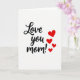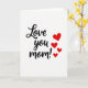 This greeting card features the message “Love you mom!” in black, flowing cursive-style lettering placed front and center on a white background. To the right of the words, four red hearts appear in a small cluster, with a couple slightly larger than the others. The hearts look like they’re gently drifting upward, which adds a soft sense of motion. The bright red against the white space makes the design feel focused and easy to take in at a glance. It comes across as affectionate and grateful, like a simple note you really mean. Giving it feels meaningful because it says what many people want to say to their mom, without needing a long explanation 🥰. It’s a sweet way to share Valentine’s Day feelings with someone you love ❤️.