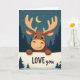 On the front of the card is a friendly cartoon moose peeking out from a snowy forest at night. The moose has light-brown antlers, a rounded snout, dark shiny eyes, and a right-eye wink with a small half-smile. A soft pink blush on its cheek makes it look a little shy, like it’s letting you in on a sweet secret 🥰. In front of the moose is a white banner, and the words “LOVE you” are written across it, with “LOVE” larger and “you” smaller in a smooth, cursive-style look. The sky behind is deep indigo with a crescent moon and scattered stars, and dark pine trees stand in the background over gentle hills of snow. It feels calm and cozy, like a quiet moment shared with someone you care about. Giving this card says “I’m thinking of you” in a simple, affectionate way that works for romance or close friendship ❤️, and it’s a lovely way to share Valentine’s Day sentiments.