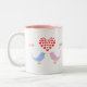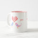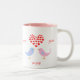 Two little pink and blue lovebirds with a heart shape filled with hearts, appear on both sides of this mug. On one side the caption is "love you" in red script, and on the other "love you more". A sweet design for Valentine's day, for any romantic anniversary, or simply when you are feeling affectionate.