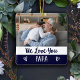 This trendy and stylish Christmas holiday ornament features two photos of you and your grandfather, with modern colour blocks in dark navy blue and white, with white handwritten script typography and cute scribbled hearts. The ornament says "we love you Papa."
