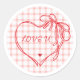 The image shows a round sticker design with a soft pink-and-white gingham (checkered) background. At the center is a hand-drawn red heart outline, styled like a ribbon that forms the heart shape. A decorative bow is tied at the top right of the heart, with flowing ribbon ends adding an elegant, whimsical touch. Inside the heart, the word “LOVE U” is written in a delicate, cursive red script, and a small red heart appears near the bottom for extra charm. The overall feel is romantic, cozy, and playful, perfect for expressing affection or love-themed designs.