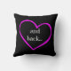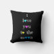 Love you to the Moon.... and back (pink on black); Colourful Throw Pillow; front says: i love you to the moon (with colourful hearts); back side has the words "and back" inside of a hand-drawn pink heart!