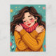 A cute whimsical folk art style postcard to keep in touch with a friend or family member with a girl in a warm cosy sweater giving herself a hug. Remember yourself that self-love is important with this pretty ai illustration.