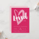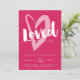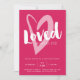 An invitation for a Valentine's day party at home or church, or for a a youth/ladies church event. This modern typographic design features a hand drawn light pink heart overlaid with "Loved" in white brush lettered font and the scripture reference Jeremiah 31:3 on a background of fuchsia pink.