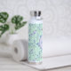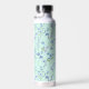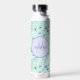 This beautiful water bottle features an aqua blue green background with dainty purple flowers all over. There is a template provided for you to put your name and initial.