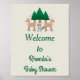A beautiful poster, this design features a grey background with green trees with deer and racoon. Underneath is "Welcome to Rhonda's Baby Shower" written in fun green font. Order yours today!