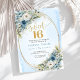 Perfect for elegant, modern, or garden-inspired parties, the harmonious mix of dusty blue, white florals, and greenery creates a timeless look that feels both youthful and upscale. The gold frame adds a subtle touch of glamour, making this design ideal for formal Sweet Sixteen events, evening celebrations, or classy birthday themes. The balanced layout ensures party details are easy to read while maintaining a polished, photo-worthy presentation.
