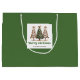 Minimalist watercolor christmas tree gift bag with playful leopard pattern in earthy green and gold. Personalise with your custom name for a stylish Christmas gift presentation.