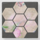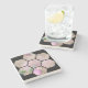 The coasters are gorgeous, a quality feel and heavy weight. They look like a precious archeological find. A rustic stone juxtaposed with a modern floral black and white print. I like the way the print goes slightly imperfect on the cut stone edges giving them a kind-of natural beauty.