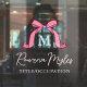 Lovely personalized window cling for your office door with your initial framed by a pretty bow in pink with off-white stripes. Write your name beneath in a lovely script and add your title as well. This is a great way to decorate your door and let your customers, clients, and coworkers know who's working behind that door. For beauty consultants, pageant coaches, makeup artists, boutique owners, and much more!