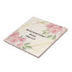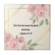 This ceramic tile features an elegant and decorative design. It has a soft floral pattern with delicate pink roses and lush green leaves adorning the top right and bottom left corners, adding a touch of warmth and charm. Gold geometric lines form a sophisticated square frame around the central text, giving the tile an artistic and refined appearance. The text inscribed in the centre reads: