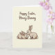 This card features two stylised rabbits cuddling close, outlined with fine lines and filled with a soft taupe tone that suggests gentle fur 🐰. One rabbit stands upright and leans in to nuzzle the other’s head, while the second reclines calmly with wide, expressive eyes that give the pair a tender, affectionate look. Light shading adds a subtle sense of depth along their ears, cheeks, and bodies, keeping the drawing simple but warm. The background is a creamy beige that feels quiet and airy, letting the rabbits remain the clear focal point. Near the top, a short Easter greeting appears in flowing cursive-style lettering, set in dark brown for strong contrast against the pale backdrop 🌷. The text is centred above the illustration, leaving comfortable open space between the words and the rabbits below. The standing rabbit’s nose touches the reclining rabbit’s forehead, and both sets of long ears curve gently inward against the soft beige field.