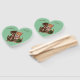 This program hand fan is mint green with a cute loving cat couple. The female is yellow and white striped the male is brown. Female cat is sharing rats from her wood green basket with her male friend. Customize your names with the templates.