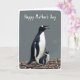 This card shows an adult flightless bird in striking black-and-white feathers standing close beside a smaller chick, their bodies centered low in the frame as if sharing a quiet, protective moment ❤️. A soft grey background keeps the scene calm and uncluttered, drawing attention to the gentle lean of the larger bird toward the little one. Warm, diffused light reveals fine feather textures, from the adult’s sleek coat to the chick’s fluffy down, adding a tender, close-knit feel. The adult’s orange beak and bright-ringed eye stand out, with the beak slightly open as though offering a soft call to its companion. The chick stays tucked near the adult’s side, looking outward with a calm gaze that suggests trust and closeness 🌼. Along the bottom edge, a nest-like ground of twigs, small stones, and earthy bits anchors them in a natural setting. Near the top, the words “Happy Mother’s Day” are placed prominently in dark lettering against the pale background. The adult and chick stand above the textured nest floor, framed by the muted grey space and the message overhead.