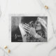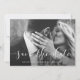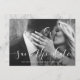 This elegant save the date card features your personal photo with a romantic white script overlay, and a modern marble look on the back.