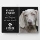 Adorable pet memorial plaque featuring a photo of your beloved pet, and a sympathy quote that reads "No longer by our side, but forever in our hearts.", a pawprint, your dogs name, and dates. A wonderful keepsake and tribute for the family.
