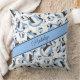 This cute volleyball team colours throw pillow for girls features a pattern of varied size stylised light blue, black and white volleyballs turned every which way overlying a volleyball net detail graphic - the volleyballs' blue and black panels are blended with an artsy, girly floral pattern  - personalise her name in a sophisticated handwritten font on a bold, angled, full width blue colour strip - background and name strip colours are customisable - by katz_d_zynes