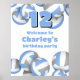 This volleyball themed birthday party welcome poster is fully customizable and features randomly arranged light blue, gray and white volleyballs, upon which you can personalize your custom message and the child's age, or customize the text to suit your event - by katz_d_zynes