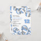 This volleyball themed party invitation for a birthday or team party features clusters of light blue, grey and white volleyballs at the top and bottom edges on the front and a single cluster covering the back of the invitation - customise the party details on a white background - by katz_d_zynes