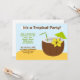 This tropical party invitation is perfect for a birthday party, luau, or anytime your party has a tropical tiki theme. Features a cocktail in a coconut with a beautiful hibiscus flower and straw, on the beach under a blue sky with clouds.