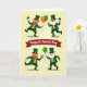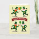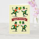 This card shows a St. Patrick’s Day scene split into two matching panels on a pale yellow background, with pairs of leprechauns interacting like close friends sharing a laugh 💚. Across the center, a wide crimson banner divides the layout, and the words “Happy St. Patrick’s Day” sit in white lettering right on the banner. In the top panel, one leprechaun with a red beard and one with a white beard lean toward each other as they hold up three-leaf shamrocks, their faces turned as if trading a friendly toast. They wear emerald top hats with gold buckles, green suits, and bright orange vests that add a warm pop of color. Between them, a small cluster of green and orange balloons floats upward, echoing the party mood ☘️. In the bottom panel, the red-bearded leprechaun lifts a frothy golden mug while the white-bearded one steadies a single green balloon, their poses angled inward like they’re sharing the moment together. Gold accents on the hats and the beer foam stand out against the greens and oranges, and the two-panel layout stays neatly balanced with the banner centered between them.