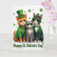 This card shows three dressed-up cats gathered close for St. Patrick’s Day, their shoulders nearly touching as if they’re posing for a friendly photo 💚. In the middle, an orange tabby with big green eyes wears a textured green knit sweater with a small orange heart on the chest and a little leprechaun hat tilted forward. To one side, a grey tabby leans in with green-framed sunglasses and a tiny green hat, giving the group a cool, companionable look. On the other side, a black-and-white cat stands neatly in a green suit jacket with gold buttons, a pleated white shirt, a green bow tie, and matching green-rimmed shades, topped with a miniature hat. The background is bright white, lightly scattered with green shamrocks and four-leaf clovers ☘️, so the green outfits stand out. “Happy St. Patrick’s Day” appears neatly on the front in green lettering, set to frame the trio without covering them. Small clover shapes dot the open space around their hats and shoulders, like confetti drifting across the white backdrop.