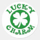 Green and white circle emblem with lucky charm in circular round text. Four leaf clover shamrock for the luck of the irish! Copyright © www.CuteComfy.com