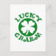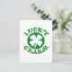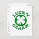 Green and white circle emblem with lucky charm in circular round text. Four leaf clover shamrock for the luck of the irish! Copyright © www.CuteComfy.com
