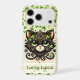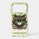A charming black kitty adorned with gold swirls, glittering shamrocks, and sparkling green eyes.