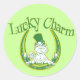 St. Patrick's Day Lucky Charm Leprechaun funny t-shirts, sweatshirts, hats, stickers and more. Leprechaun sitting on horseshoe holding beer. Show your Irish pride, Celtic humour.