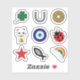 A collection of nine symbols of luck and protection: a four-leaf clover, a horseshoe, a barn star, a Maneki Neko cat, a Nazar amulet, a Chinese coin, a ladybug, a rainbow, and the fish of Christ (ichthys) make up this sticker pack collection.
