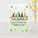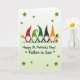 On the front of the card five gnomes stand shoulder to shoulder on a slim green strip, their fluffy white beards brushing the ground as they lean slightly toward one another like close friends. Their tall cone hats alternate through red, several greens, black, and orange, each dotted with small white spots or curled patterns that repeat across the row. A pale green background fades lighter toward the top, giving the scene a soft glow behind the figures. Darker green shamrocks float around them, framing the group with little bursts of ☘️. On the far left, one gnome lifts a golden mug as if toasting the others, while the far-right gnome cradles a tiny pot of gold with green and yellow balloons rising above it 🌈. Centered beneath the gnomes, the message “Happy St. Patrick’s Day! * Father in Law *” appears in green lettering. The hats’ white dots and the scattered shamrocks echo each other across the pale green gradient backdrop.