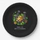 Paper plates with a St. Patrick's Day themed image. A black and gold horseshoe sitting in a bed of green clover with shiny gold coins.