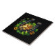 Ceramic tile with a St. Patrick's Day themed image. A black and gold horseshoe sitting in a bed of green clover with shiny gold coins.