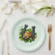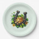 Paper plates with a St. Patrick's Day themed image. A black and gold horseshoe sitting in a bed of green clover with shiny gold coins.