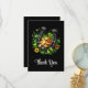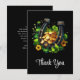 Thank you card with a St. Patrick's Day themed image. A black and gold horseshoe sitting in a bed of green clover with shiny gold coins.