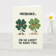 This card shows two anthropomorphic four-leaf clovers standing close together on a soft, creamy background, their bodies angled inward like they’re sharing a private joke 💚. The left clover is a deeper emerald green, while the right one is a lighter lime green, giving them a gentle contrast that’s easy on the eyes. Each has wide, bright eyes, a big smile, and small orange blush circles on their cheeks that make their connection feel tender and a little bashful ☘️. Their thin, stick-like arms and legs keep the look simple, and their feet rest above faint oval shadows that lightly anchor them to the page. At the top, “HUSBAND..” appears in black, all caps, centered and spaced to stand out against the pale background. At the bottom, “I’M SO LUCKY TO HAVE YOU.” is also in black, all caps, centered, and set in a larger, easy-to-read style that balances the top line. The two clovers’ warm expressions and matching blush make them read like a devoted pair, framed by lots of open space around them. The scene stays uncluttered, with the only extra details being the soft shadows beneath their feet and the crisp black lettering above and below.