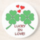Drawings of four-leaf clovers with heart shapes floating over them.